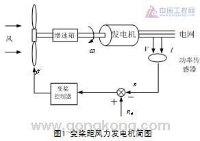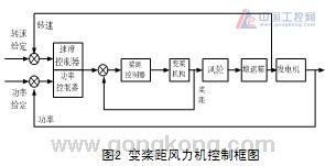 如圖2所示為變槳距控制器的原理框圖。在發動機并入電網之前由速度控制器根據發動機的轉速反饋信號進行變槳距控制,根據轉速及風速信號來確定槳葉處于待機或順槳位置;發動機并入電網之后,功率控制器起作用,功率調節器通常采用PI(或PID)控制,功率誤差信號經過PI運算后得到槳距角位置。