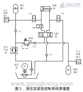 本文實驗中采用國外某知名風電公司風力發電機組作為實驗對象,其額定功率550KW,采用液壓變槳系統,液壓變槳系統原理圖如圖3所示。從圖3中可以看出,通過改變液壓比例閥的電壓可以改變進槳或退槳速度,在風力機出現故障或緊急停機時,可控制電磁閥J-B閉合、J-A和J-C打開,使儲壓罐1中的液壓油迅速進入變槳缸,推動槳葉達到順槳位置(90�)。