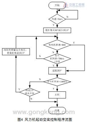 風力機起動時變槳控制程序流程如圖4所示。當風速高于起動風速時PLC通過模擬輸出單元向比例閥輸出1.8V電壓,使葉片以0.9�/s的速度變化到15�。此時,若發電機的轉速大于800r/min或者轉速持續一分鐘大于700r/min,則槳葉繼續進槳到3�位置。PLC檢測到高速計數單元的轉速信號大于1000r/min時發出并網指令。若槳距角在到達3�后2分鐘未并網則由模擬輸出單元給比例閥輸出-4.1V電壓,使槳距角退到15�位置。