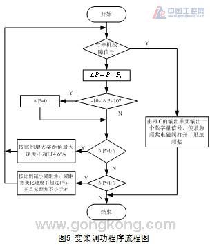 發電機并上電網后通過調節槳距角來調節發電機輸出功率,功率調節程序流程圖如圖5所示。當實際功率大于額定功率時,PLC的模擬輸出單元CJ1W-DA021輸出與功率偏差成比例的電壓信號,并采用LMT指令使輸出電壓限制在-4.1V(對應變槳速度4.6�/s)以內。當功率偏差小于零時需要進槳來增大功率,進槳時給比例閥輸出的最大電壓為1.8V(對應變槳速度0.9�/s)。為了防止頻繁的往復變槳,在功率偏差在�10kW時不進行變槳。