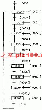 按下起動按鈕SB1,輸入點0000為ON,則作為互鎖條件的輔助繼電器1000為ON,互鎖指令IL接通,IL與ILC之間的線圈正常工作,“全部輸出禁止”解除。若(抓圖1)常閉觸點都為ON,保持繼電器HR000接通,輸出點0503使上升電磁閥得電,手臂上升。當手臂上升到位時,上升限位開關使輸入點0005閉合,保持繼電器HR001 接通,HR000復位,輸出點0501使左轉電磁閥得電,手臂左轉。......以后每當一步動作到位,限位條件滿足時,狀態轉移,進行下一工步動作。當狀態轉移到HR008為ON時,輸出點0506使放松電磁閥得電,機械手放松,同時定時器TIM00計時。當計時2秒到,狀態又轉移到HR000,程序又重新從第一工步開始循環。