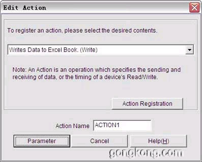 點(diǎn)擊Action List在右邊空白處取得動作列表,在列表空白處點(diǎn)擊右鍵選擇Register Action進(jìn)入Edit Action界面。點(diǎn)擊下拉菜單選擇您要進(jìn)行的動作,此處我們以寫數(shù)據(jù)到Excel文檔為例。選中后點(diǎn)選Action Registration按鈕,選擇Excel的執(zhí)行程序。