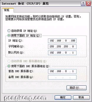 * 設(shè)置PC的IP地址:右鍵點(diǎn)擊“網(wǎng)上鄰居”,選擇屬性即進(jìn)入“網(wǎng)絡(luò)連接”窗口,右鍵點(diǎn)擊“本地連接”,選擇屬性即進(jìn)入“本地連接屬性”窗口,雙擊Internet協(xié)議(TCP/IP),修改屬性如下(本例設(shè)計(jì)算機(jī)為192.168.0.188,GP為192.168.0.100)。