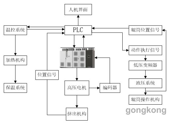 擠出機(jī)控制系統(tǒng)的主要作用,是在擠出過(guò)程中實(shí)現(xiàn)對(duì)螺桿轉(zhuǎn)速、機(jī)筒溫度和熔體壓力等工藝參數(shù)的控制。目前,以儀表控制系統(tǒng)、PLC控制系統(tǒng)為主要選擇。兩者的功能分別為:溫度控制中儀表控制系統(tǒng)可以實(shí)現(xiàn)開(kāi)關(guān)兩控制,也可以采用智能儀表實(shí)現(xiàn)簡(jiǎn)單比率控制,而PLC控制系統(tǒng)可以通過(guò)模擬量通信實(shí)現(xiàn)PID(比率-積分-微分控制)控制;前者壓力控制顯示熔體壓力,而后者顯示熔體壓力并實(shí)現(xiàn)閉環(huán)控制;前者的測(cè)試功能只有顯示功能,而后者可以實(shí)現(xiàn)測(cè)試單元的串口通信。擠出機(jī)的控制系統(tǒng)主要由電氣、儀表和執(zhí)行機(jī)構(gòu)組成,其主要作用為: