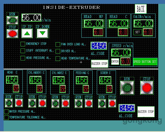 FR-E740-90K-CHT有編碼器反饋,精確控制電機(jī)的速度,實(shí)現(xiàn)閉環(huán)控制電機(jī)轉(zhuǎn)速,只要有故障動(dòng)作就停止工作,同時(shí)GT1045-QSBD人機(jī)界面跳轉(zhuǎn)到故障顯示畫(huà)面,在畫(huà)面上可以看到擠出機(jī)的相應(yīng)部位的故障原因,故障部分有詳細(xì)的文字說(shuō)明。人機(jī)界面為用戶提供4組畫(huà)面,分別為“開(kāi)機(jī)介紹”、“參數(shù)設(shè)定”、“手動(dòng)調(diào)整”、“運(yùn)行狀態(tài)”。