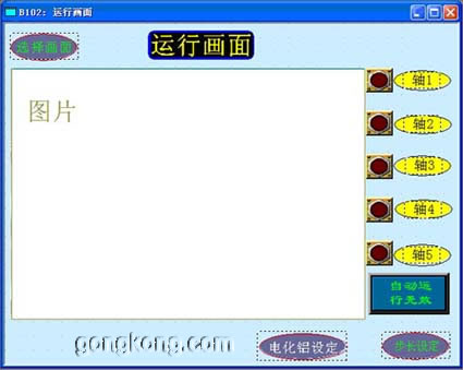 上面軸1-5是手動動作,按住不動,該軸以比較小的速度進行微調。“自動運行無效”按鈕按下去變成:“自動運行有效” ,此時,當走紙機給個燙金信號是,各個軸將按步長設定各走各自的步長。如果是“自動運行無效” ,無論有沒有信號,各個軸部不動作。