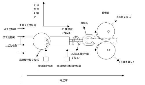 輥鍛傳送系統由輥鍛機,機械手傳送機構組成運動控制器 其中,輥鍛機由上下兩個壓輪,模具組成。模具固定在上下兩個壓輪上,由滾輪帶動實現對產品的鍛壓。滾輪由兩臺15K伺服電機同時轉動實現模具同步滾壓輥鍛傳送 機械手傳送機構由機械爪轉動軸,X方向送料軸,Y方向工位移動軸,底盤旋轉軸以及部分定位傳感器組成輥鍛傳送 具體如下圖: