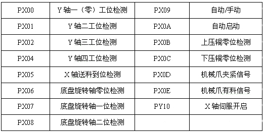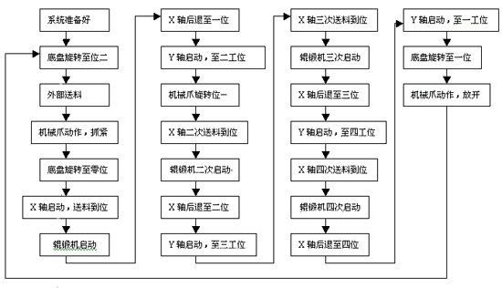 輥鍛機由兩臺MR-J2S-15K B4及HA-LFS15K14驅動輥鍛傳送 上下壓輥同時啟動,保持同步;機械手傳送結構主要由四臺MR-J2S-700B及HC-SFS702驅動。上下壓輥啟動由X軸方向送料到位檢測,機械瓜夾緊信號及壓輥零位信號啟動。每工位轉動一圈,回到原點,壓輥轉動過程中X軸伺服OFF,處于自由滑動狀態,自由滑動到位一檢測信號接通(送料到位信號斷開)后,X軸伺服ON,Y軸啟動,由第一工位運動至第二工位,二工位檢測信號接通,機械爪旋轉軸旋轉一定角度后,X軸啟動快速行進至二工位,到位檢測信號接通,X軸伺服OFF,處于自由狀態,上下壓輥啟動。如此,進行三工位,四工位輥壓成型。四個工位結束后,Y軸返回一工位,機械瓜旋轉軸返回原角度;底盤旋轉軸轉動一定角度,旋轉到位檢測一接通,機械爪松開,成型產品被送入傳送帶。機械爪松開后,底盤旋轉軸繼續旋轉一定角度,旋轉到位檢測二接通,自動送料系統開始送料,有料檢測接通后,機械爪抓緊;夾緊信號接通,底盤旋轉軸旋轉至原始位置,周期工作開始。