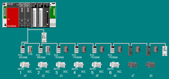 整個控制系統由6軸組成,壓輥軸功率較大;從性能穩定性考慮,我們選用兩臺MR-J2S-15KB4及HA-LFS15K14驅動上下壓輥;四臺MR-J2S-700B及HC-SFS702驅動機械手傳送結構。控制系統選用多CPU系統:Q02CPU+Q172CPUN,Q172CPUN最多可以控制8軸,編程方便簡單。用SSCNET總線與伺服放大器進行連接,方便可靠。具體參見下圖: