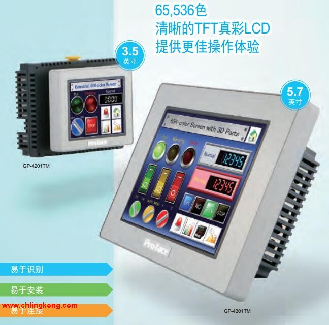 接口:內置DIO 32點(16點輸入/16點輸出,NPN型)+FLEX NETWORK接口PFXGM4301TAD(GP-4301TM)尺寸:5.7英寸。