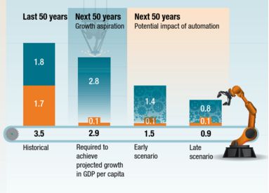 雖然目前大部分關于自動化的爭論在于它會造成大規模的失業,人們還是會繼續與機器一起工作,從而促進人均國內生產總值的增長,這是全球每個國家都在追求的。因此,我們對生產力的評估是假設被自動化取代的人們會找到其他的職位。