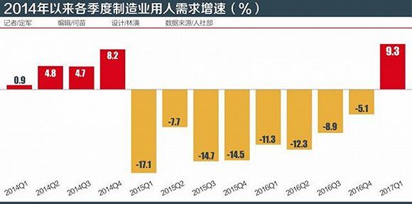 人力資源部調查也顯示,2017年一季度制造業用人需求增速為9.3%,低于金融業用人需求32.1%的增速,也低于房地產業用人需求增速。