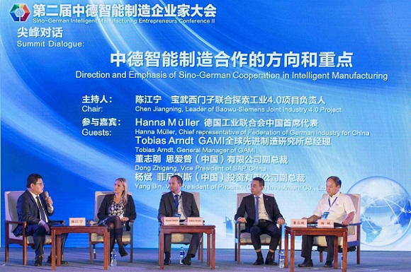 在尖峰對話環節,寶武西門子聯合探索工業4.0項目負責人陳江寧、德國工業聯合會中國首席代表Hanna Müller、GAMI全球先進制造研究所總經理 Tobias Arndt、思愛普(中國)有限公司副總裁 董志剛、菲尼克斯(中國)投資有限公司副總裁楊斌圍繞“中德智能制造合作的方向和重點”展開了深入討論。