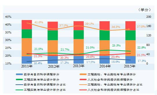工程教育不斷調整課程模塊,呈現工科特色,人文社會科學類通識課程模塊受到重視,課程設置更關注對學生通用能力的培養,工程實踐與畢業設計模塊學分及占比有所上升,畢業設計(論文)更加體現工程性,反映專業更加注重對學生工程實踐能力的培養。