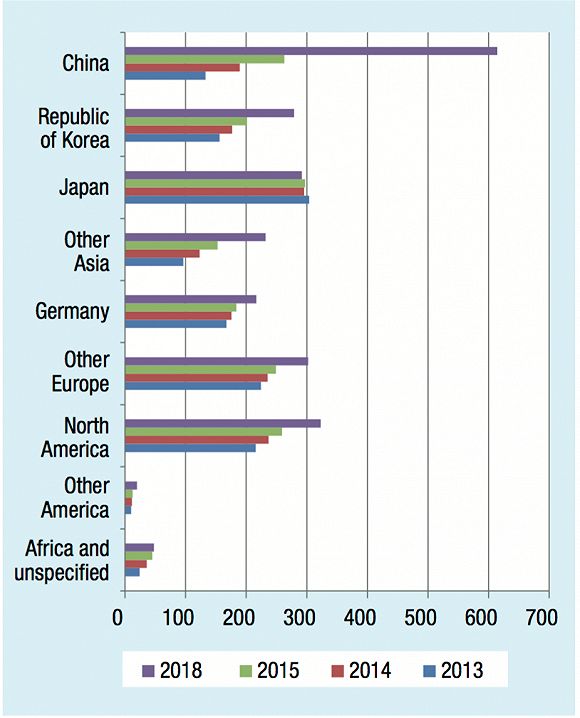 2013-2018年部分地區的使用的工業機器人數量 單位:千 來源:UNCTAD