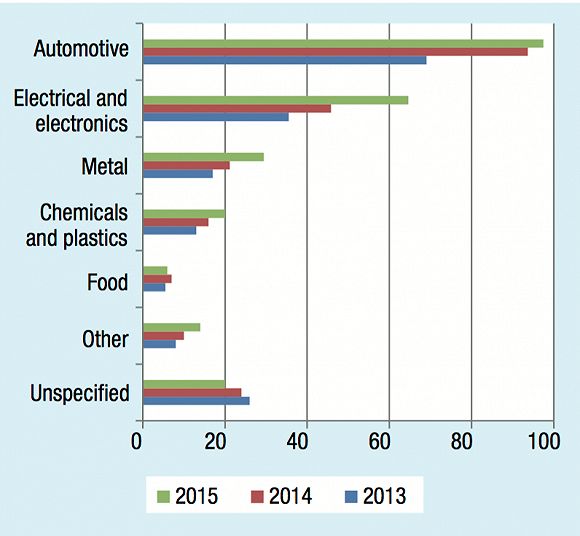 2013-2015年全球工業機器人主要供應的行業。來源:UNCTAD