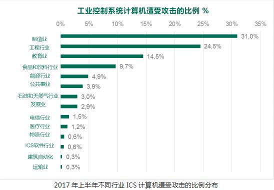 今年前六個(gè)月,卡巴斯基實(shí)驗(yàn)室產(chǎn)品在37.6%的工業(yè)控制系統(tǒng)計(jì)算機(jī)上攔截了攻擊。我們會(huì)從這些計(jì)算機(jī)上接收匿名信息,總數(shù)量達(dá)到數(shù)萬。這一數(shù)據(jù)與上一期相比,幾乎沒有變化——較2016年下半年相比,下降了1.6個(gè)百分點(diǎn)。受攻擊的目標(biāo)大多都是制造各種原料、設(shè)備和商品的制造企業(yè)。其他遭受影響較嚴(yán)重的行業(yè)還包括工程行業(yè)、教育業(yè)以及食品和飲料行業(yè)。能源企業(yè)的工業(yè)計(jì)算機(jī)遭受的攻擊占全部攻擊的近5%。